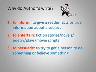 Authors write to inform readers by providing factual information on a subject, to entertain through fiction like stories, novels, poetry, plays and movie scripts, or to persuade readers to do or believe something.