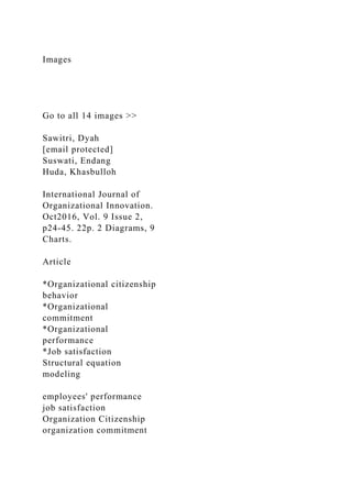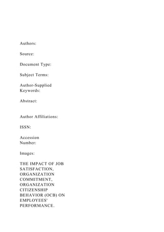 This study examines the impact of job satisfaction, organizational commitment, and organizational citizenship behavior (OCB) on employees' performance at an electricity company in Indonesia. The authors surveyed employees to measure these factors and used statistical analysis methods like descriptive analysis and structural equation modeling. The results showed that job satisfaction and organizational commitment positively influence OCB. Job satisfaction also affects organizational commitment. Additionally, organizational commitment and OCB were found to positively influence employees' performance, while job satisfaction did not directly impact performance. Overall, job satisfaction and organizational commitment were found to indirectly affect performance through their influence on OCB.
