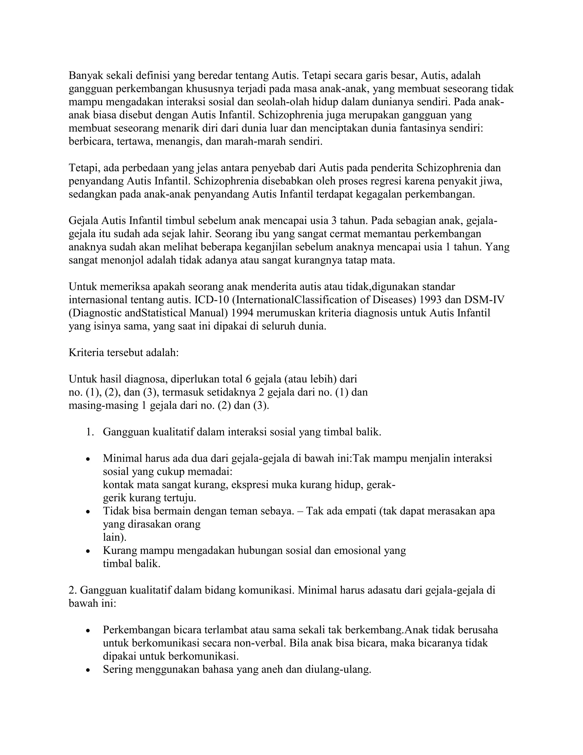 1. Autisme adalah gangguan perkembangan khususnya pada masa anak-anak yang membuat seseorang tidak mampu berinteraksi secara sosial dan hidup dalam dunianya sendiri.