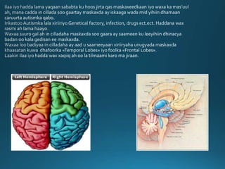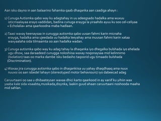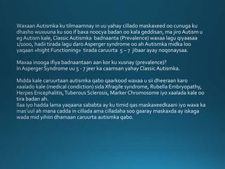 Goorta aan fahamno bulsho ahaan waxa uu yahay AUTISMka, goorta aan fahamno sida loola dhaqmo caruurta Autismka qabto, xanaanaynta gaarka ah ay u baahanyihiin iyo goorta bulsho ahaan aan garano gargaarka ay u baahanyihiin waalidka dhalay caruurtaani ayaan noqon karnaa bulsho iyadu isku gargaarto.