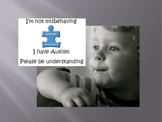 This document discusses autism, including what it is, early signs, how it affects children, related disorders, symptoms, social interaction difficulties, behaviors, signs and tests, treatments including medicine, therapy, and diet considerations. Autism is a developmental disorder appearing in the first 3 years that affects social and communication skills development in the brain. Early signs can include lack of speech, repetitive body movements, impaired social skills, and lack of eye contact. Boys are affected more than girls. Treatments aim to help with specific needs and may include applied behavior analysis therapy, medications, occupational therapy, and speech therapy. Diet changes removing gluten have shown benefits for some children with autism as well.