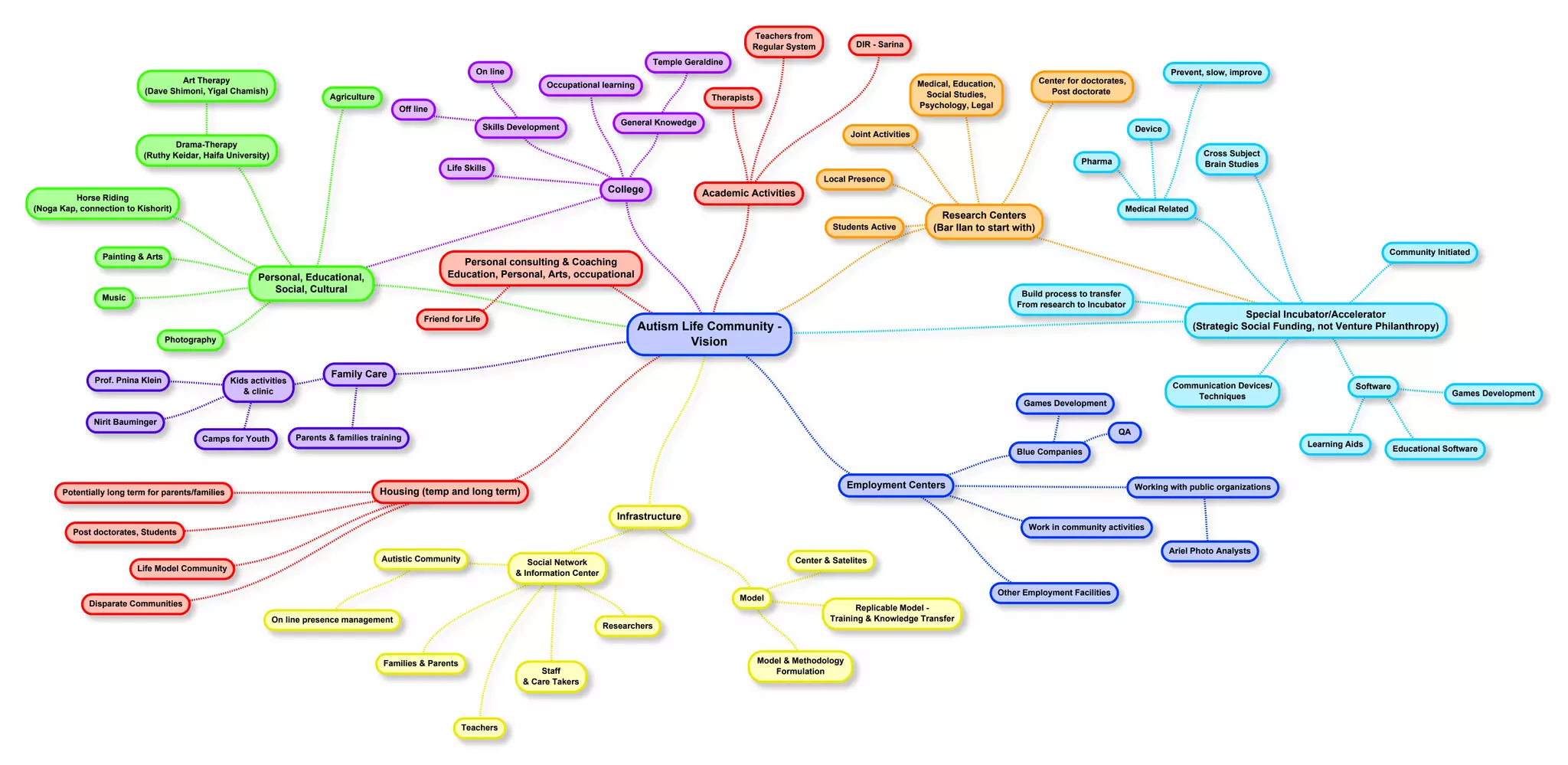 The document outlines various programs and activities that could be offered by an organization focused on education, therapy, life skills development, and research. It includes art therapy, occupational learning, agriculture skills, drama therapy, horse riding, music, photography, family care programs, camps for youth, and academic research centers in fields like medical studies, psychology, and more. The organization would aim to conduct research and transfer it into applications and programs to benefit the community.