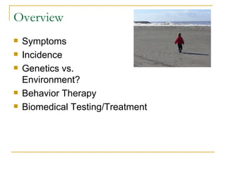 The document provides an overview of autism, including core symptoms, diagnosis criteria, prevalence and incidence rates, potential genetic and environmental causes, prognosis with and without treatment, and evidence-based behavioral and biomedical treatment options. Key points covered include applied behavior analysis therapy, dietary interventions like gluten-free/casein-free diets, supplementing vitamins/minerals/amino acids, addressing gastrointestinal issues and potential food allergies, heavy metal detoxification, and immune system regulation.