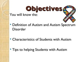 This document provides an overview of autism spectrum disorder (ASD), including its definition, characteristics, causes, assessment tools, interventions, teaching strategies, and partnerships to support individuals with ASD. Some key points covered are: