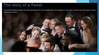 This document provides information about Twitter and how it can be used as an educational tool for individuals with autism. It includes definitions of common Twitter terms like tweets, hashtags, follows and favorites. It also describes the presenter's own experience using Twitter with their autistic child to help develop oral communication and writing skills by having the child tweet what they want along with a picture.