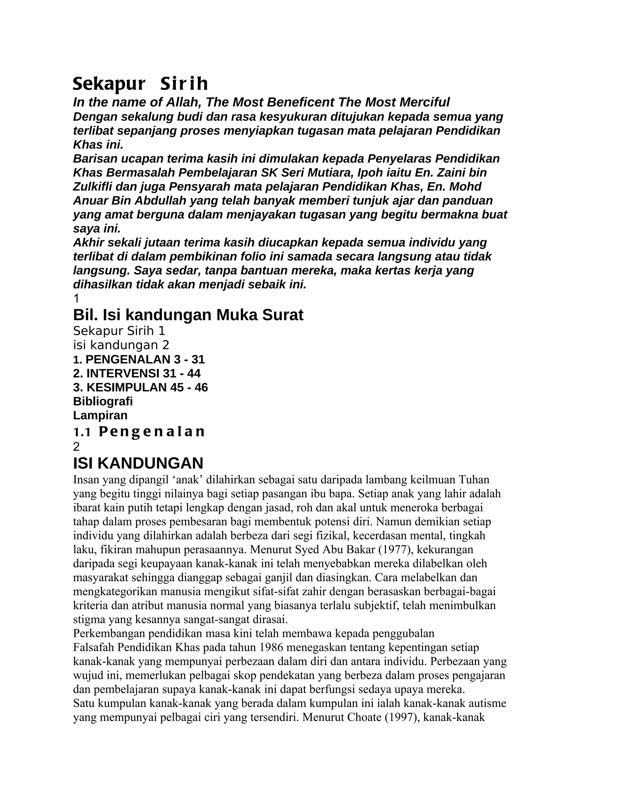 Dokumen ini membincangkan tentang pendidikan khas dan autisme, termasuk pengenalan kepada cabaran yang dihadapi oleh kanak-kanak autisme dalam perkembangan komunikasi dan sosial. Ia juga menyoroti aspek genetik dan persekitaran yang mungkin menyumbang kepada kejadian autisme, serta ciri-ciri tingkah laku yang biasa ditunjukkan oleh kanak-kanak dengan autisme. Selain itu, dokumen ini menggariskan peningkatan kesedaran dan layanan terhadap individu dengan autisme dalam masyarakat masa kini.