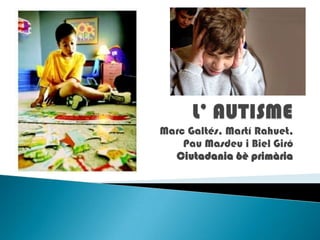 L’autisme és lamalaltia més comuna dins del grup dels trastorns del desenvolupament, conegut com a trastorns de l'espectre autista. Es caracteritza per una escassa interacció social, problemes en la comunicació verbal i no verbal, activitats i interessos greument limitats, inusuals i repetitius. Un de cada 155 nens presenten un trastorn de l'espectre autista. Definició: