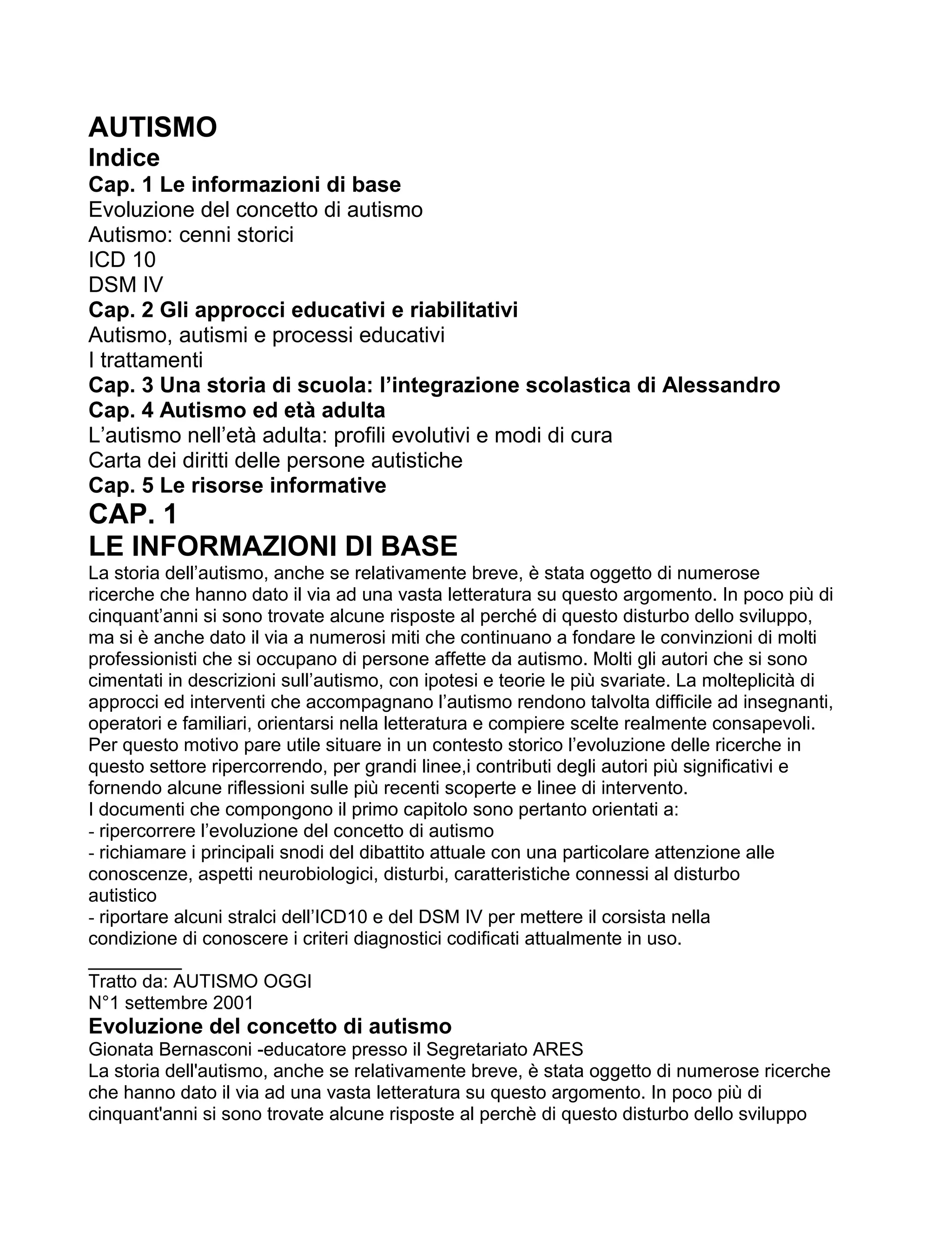 Il documento fornisce un'ampia panoramica sull'evoluzione del concetto di autismo, partendo dalle prime descrizioni e teorie formulate da Leo Kanner e Hans Asperger fino alle attuali considerazioni scientifiche. Si evidenzia come l'autismo sia stato a lungo malinterpretato a causa di miti e teorie errate, e come la comprensione di questo disturbo abbia cambiato nel tempo, spostandosi da una visione psicologica a una classificazione come disturbo dello sviluppo. Sono esplorate anche le implicazioni per i trattamenti e le risorse educative disponibili per le persone autistiche e le loro famiglie.