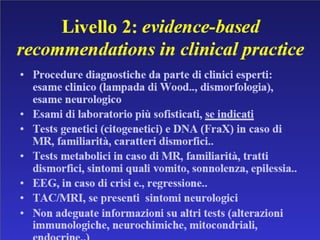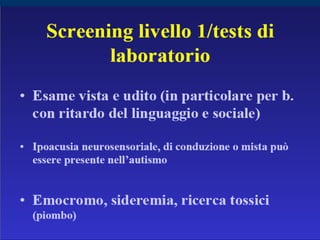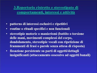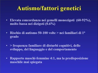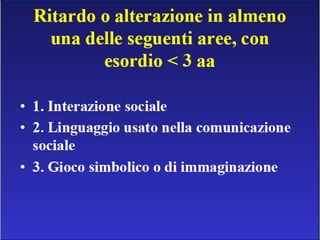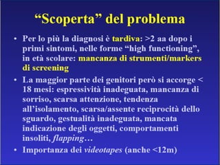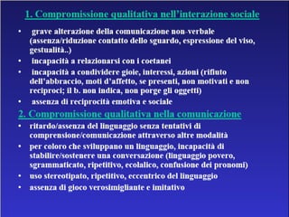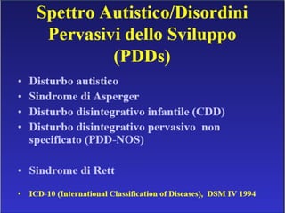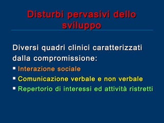 Il documento descrive i disturbi pervasivi dello sviluppo, con un focus sull'autismo, una sindrome comportamentale con origine biologica e variabilità clinica. Esamina le caratteristiche principali come la compromissione sociale e comunicativa, gli stili diagnostici e gli approcci terapeutici individualizzati. Sottolinea l'importanza di un intervento precoce e personalizzato per favorire lo sviluppo e l'integrazione sociale dei pazienti.
