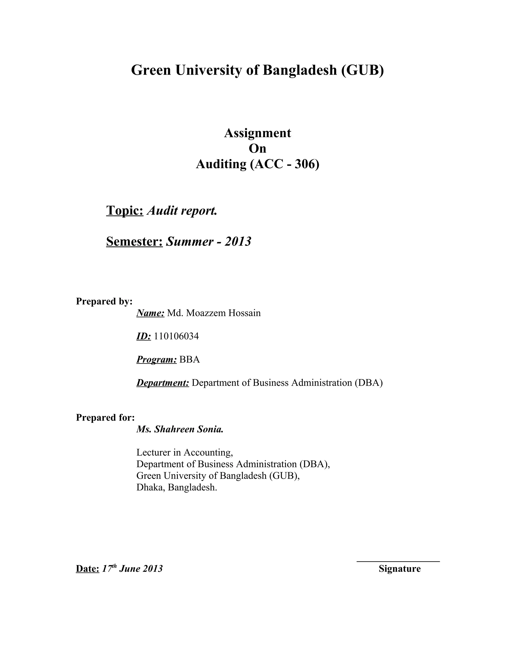 This document is an audit report submitted by Md. Moazzem Hossain, a student at Green University of Bangladesh, for his Auditing course. It includes a cover page with his information, a letter of transmittal to his lecturer submitting his assignment, and an audit report on Bata Shoe Company (Bangladesh) Limited that examines the company's compliance with corporate governance guidelines and describes the responsibilities and activities of the company's audit committee.