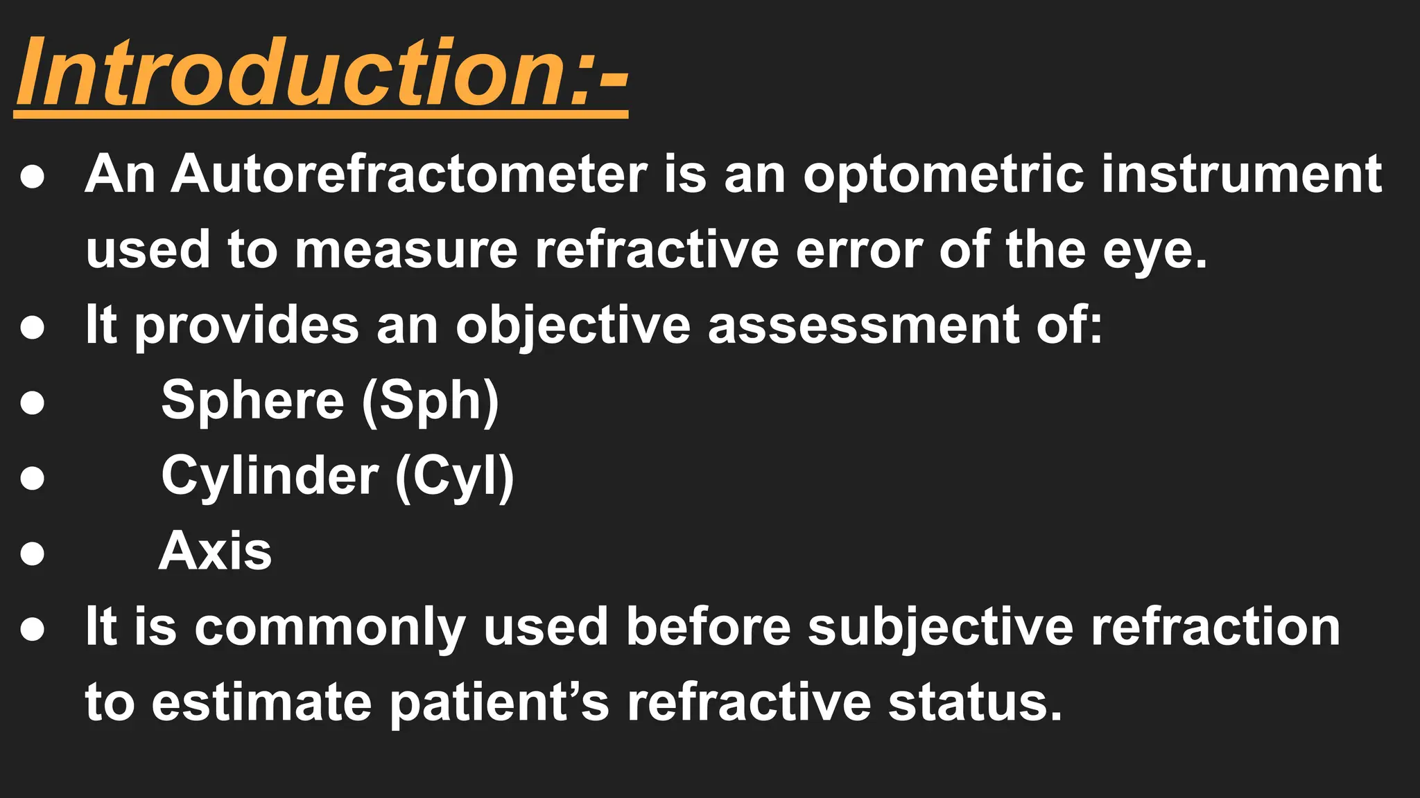 In summary, the Auto Refractometer is a modern, reliable, and convenient instrument that improves the speed and efficiency of refractive assessments. It provides essential baseline values quickly, but subjective refraction remains the gold standard for finalizing accurate visual correction.