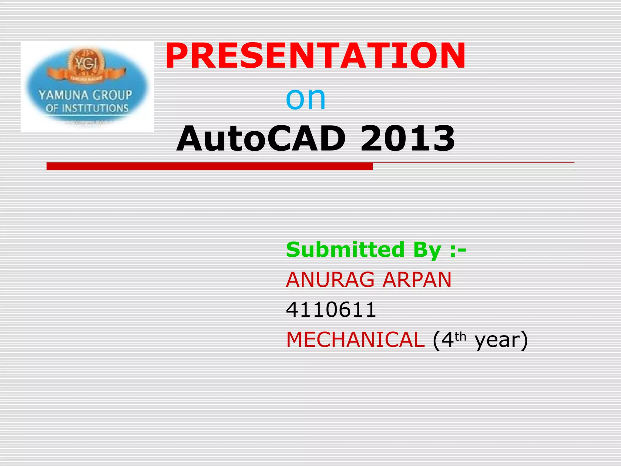 This document presents an outline for a presentation on AutoCAD 2013. It will cover the introduction to AutoCAD including its history and latest version. It will demonstrate the AutoCAD screen and interface. It will explain the coordinate system and demonstrate various 2D and 3D commands. Examples of 2D and 3D modeling projects will be shown. The presentation will conclude by discussing the benefits of using AutoCAD software.