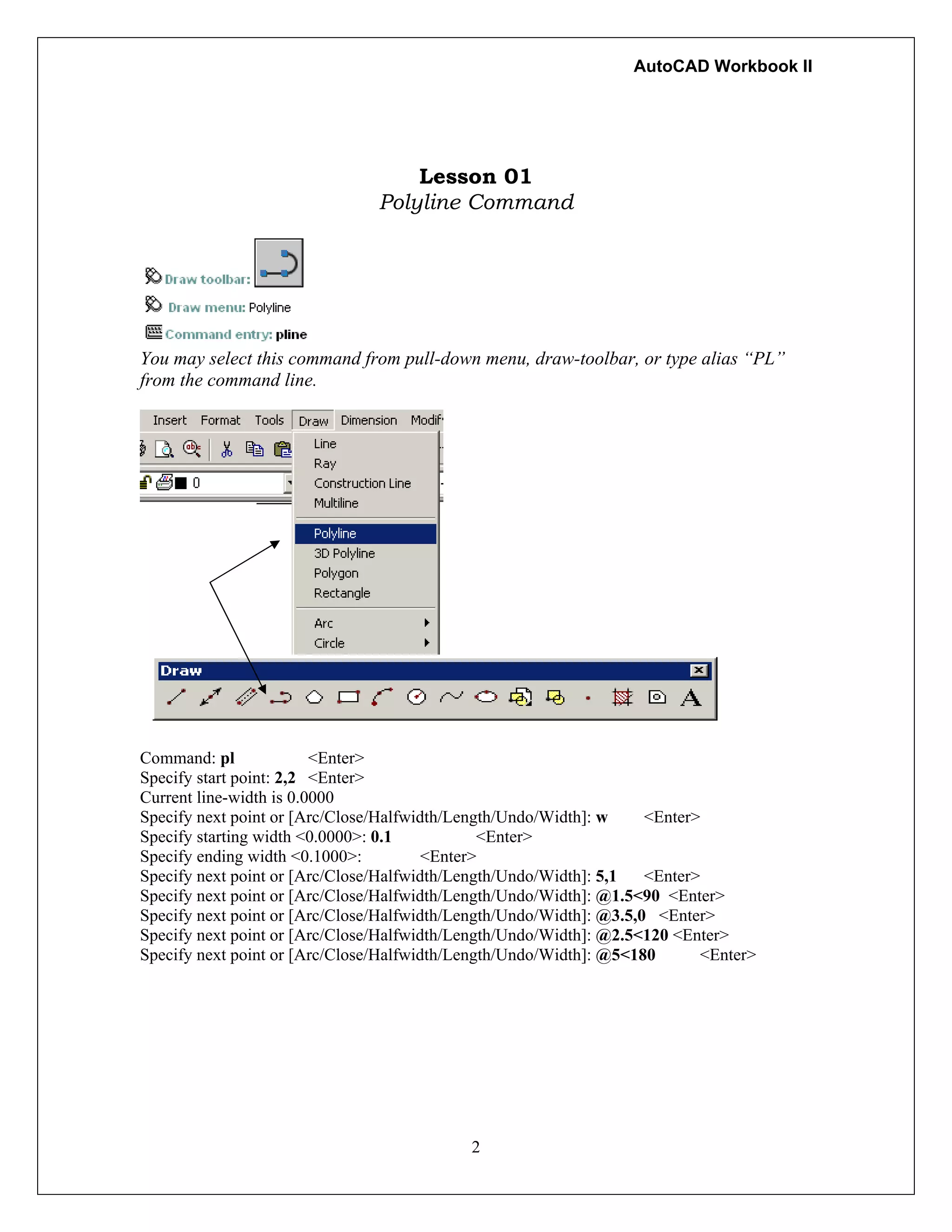 This document provides instructions for using AutoCAD's polyline, multiline, and spline commands to create geometric shapes and architectural drawings. The polyline command is used to create shapes with variable widths. The multiline command is used to draw shapes with offset lines, and different justifications. The spline command draws curved shapes, and the splinedit command edits the control points and tangents of splines. Exercises demonstrate using these commands to design geometric objects, electrical circuits, building walls and openings, and decorative door knockers.