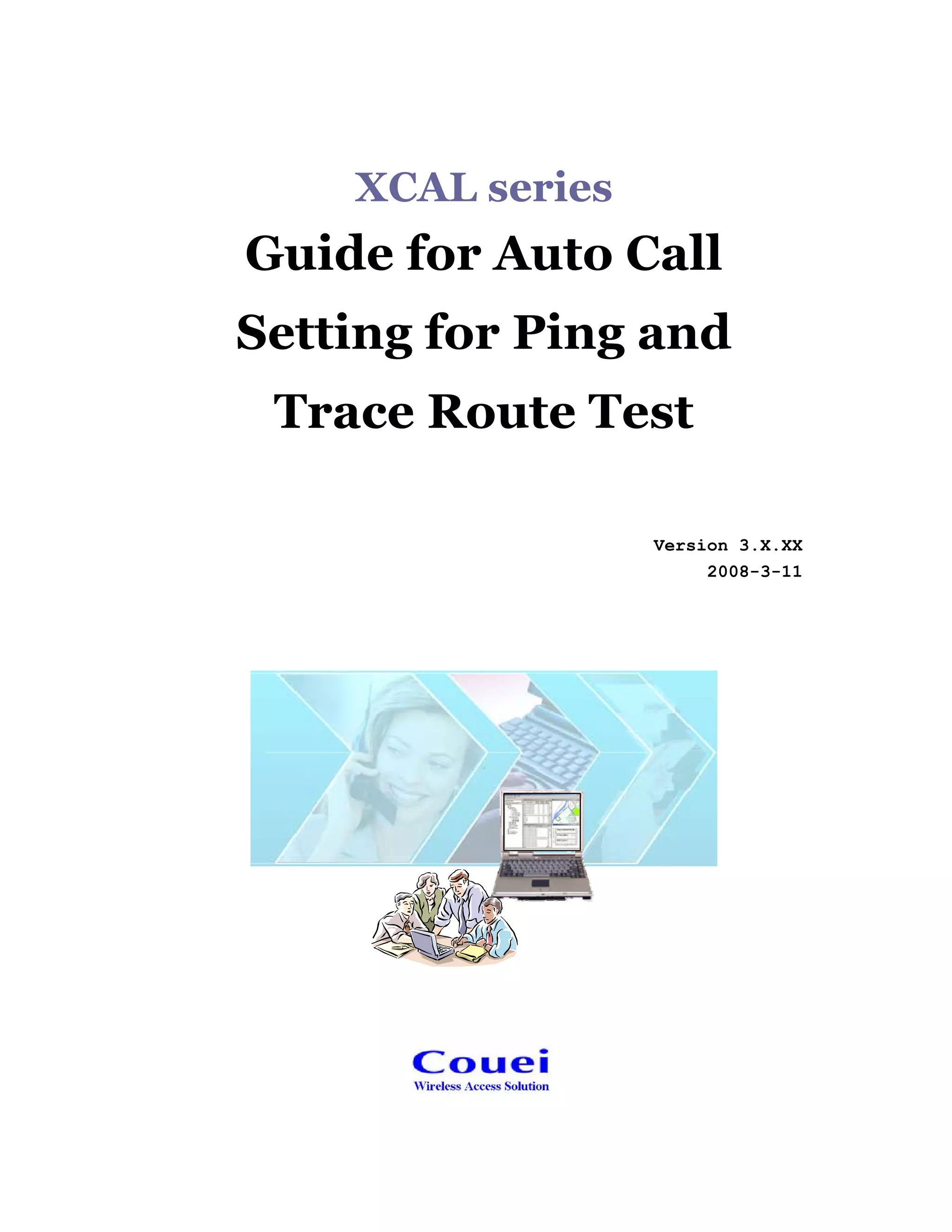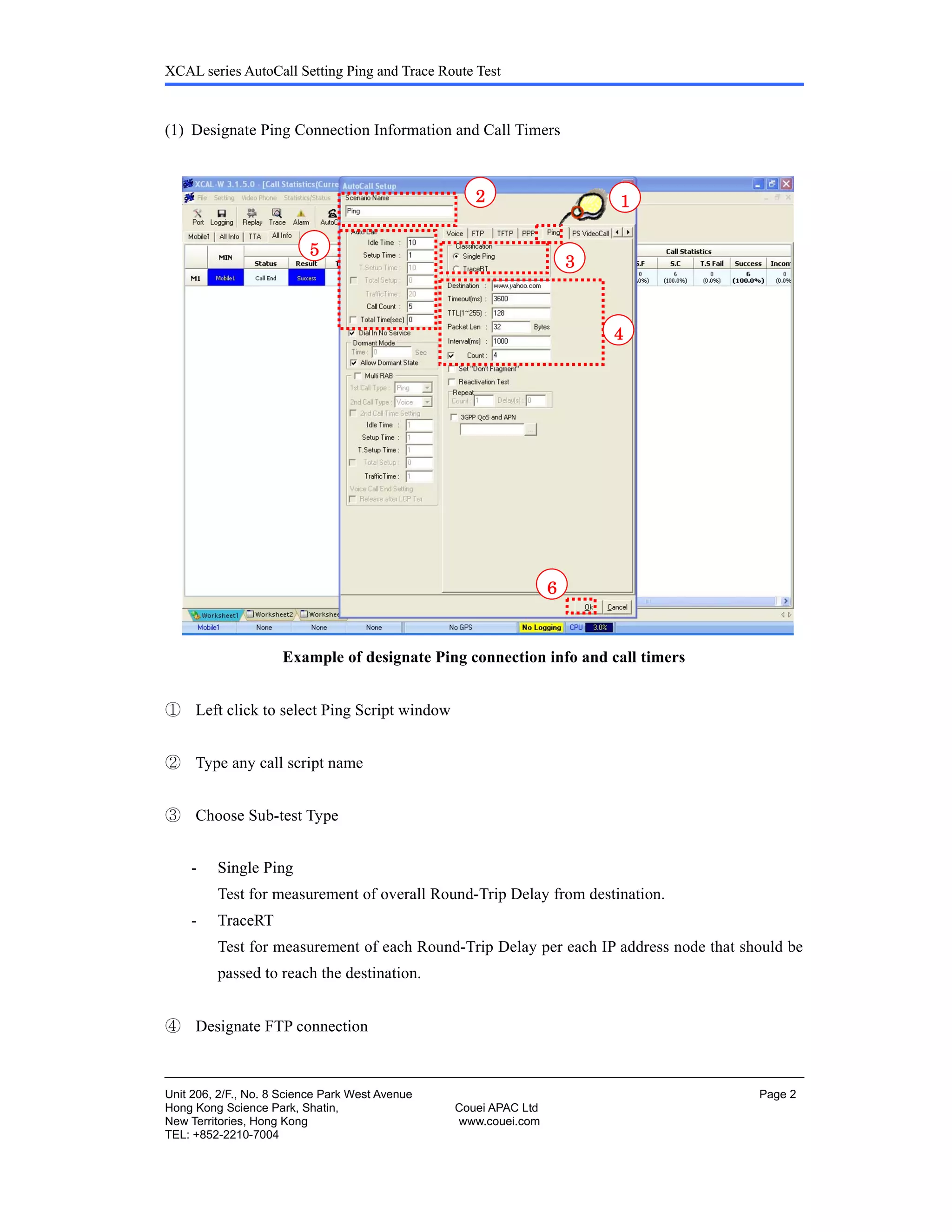 This document provides instructions for setting up and running ping and trace route tests using XCAL series AutoCall software. It describes how to designate ping connection information and call timers, including setting the destination, timeout, TTL, packet length, and count. It also explains how to set call timers for idle time, setup time, and traffic time. Finally, it notes that ping and trace route statistics can be viewed during and after the testing process to analyze results.