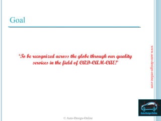 Auto-Design-Online provides online CAD, CAE, and casting consulting services. It has an experienced team that works with automotive companies like BMW and Audi. Its services include casting and stamping solutions, casting consultancy, engineering services, and corporate training. It aims to be globally recognized for quality services in CAD, CAM, and CAE fields.