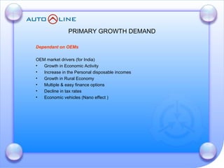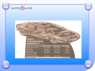The document discusses the future prospects of the Indian auto component industry. It notes that the domestic market for four-wheelers is projected to grow at 9% annually, providing good growth opportunities. It also outlines factors driving primary OEM and aftermarket demand, and lists the major auto manufacturers in India and their 2005-06 production levels. The industry is transitioning from low-volume and fragmented to competitive, adopting global standards and consolidation.