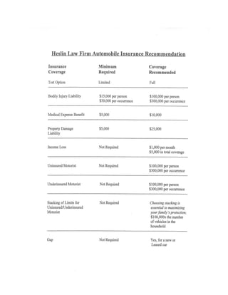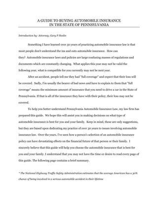This guide by attorney Gary P. Heslin explains the complexities of automobile insurance in Pennsylvania, emphasizing that many individuals misunderstand what 'full coverage' entails, which is often the minimum legal requirement rather than comprehensive protection. It details the essential and optional coverage types, outlining the importance of selecting appropriate limits to safeguard against potential financial repercussions following an accident. The document encourages drivers to consult with experienced legal counsel to navigate these issues effectively and make informed decisions about their insurance policies.