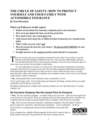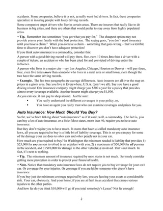 This document provides an overview of important considerations for purchasing auto insurance. It discusses: