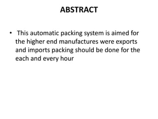 This document describes an automatic packing system that aims to efficiently package thousands of materials per hour without impacting production schedules. The system uses a load cell and sensors to detect when a container reaches the target weight within the conveyor system. A microcontroller then triggers a relay to seal the container for a set period before sending it to the packing section. The system reduces time and labor costs associated with manual packing of large volumes of materials.