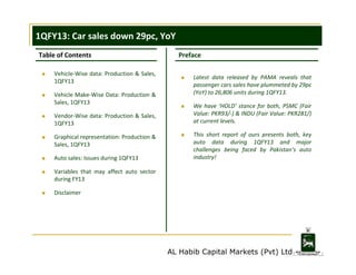 Passenger car sales in Pakistan plummeted 29% year-over-year to 26,806 units during the first quarter of FY2013 according to data from PAMA. Rising imports of used cars and increasing prices of domestically assembled cars negatively impacted sales. Discontinuation of popular models like the Suzuki Alto and Daihatsu Cuore also affected sales at PSMC and INDU. The auto industry faces additional challenges from the phasing out of tax incentives for certain models and the overall rise in domestic auto prices.