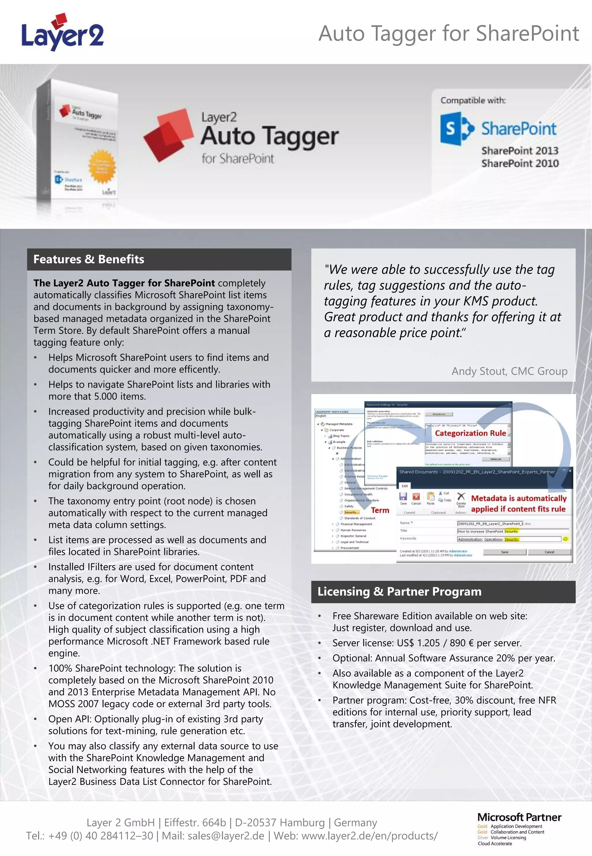 The Layer2 Auto Tagger for SharePoint automates the classification of SharePoint list items and documents using a taxonomy-based managed metadata system, enhancing user productivity by enabling quicker retrieval and navigation. It offers features such as auto-tagging, multi-level classification, and integration with existing document analysis tools, while being fully compliant with SharePoint technologies. A free shareware edition is available, with additional server licenses and support options offered for purchase.
