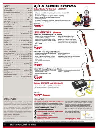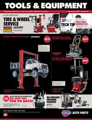 The document provides a range of professional equipment and financing options available from Carquest Auto Parts, including tire changers, pressure washers, and cooling system test kits, all valid for a promotional period from April 3, 2022, to July 2, 2022. It highlights special financing terms of up to 60 months and a limited-time offer to lease equipment with no payments for 90 days. Additionally, it includes technical tips and important information regarding new requirements for servicing air conditioning systems with R-1234yf refrigerant.