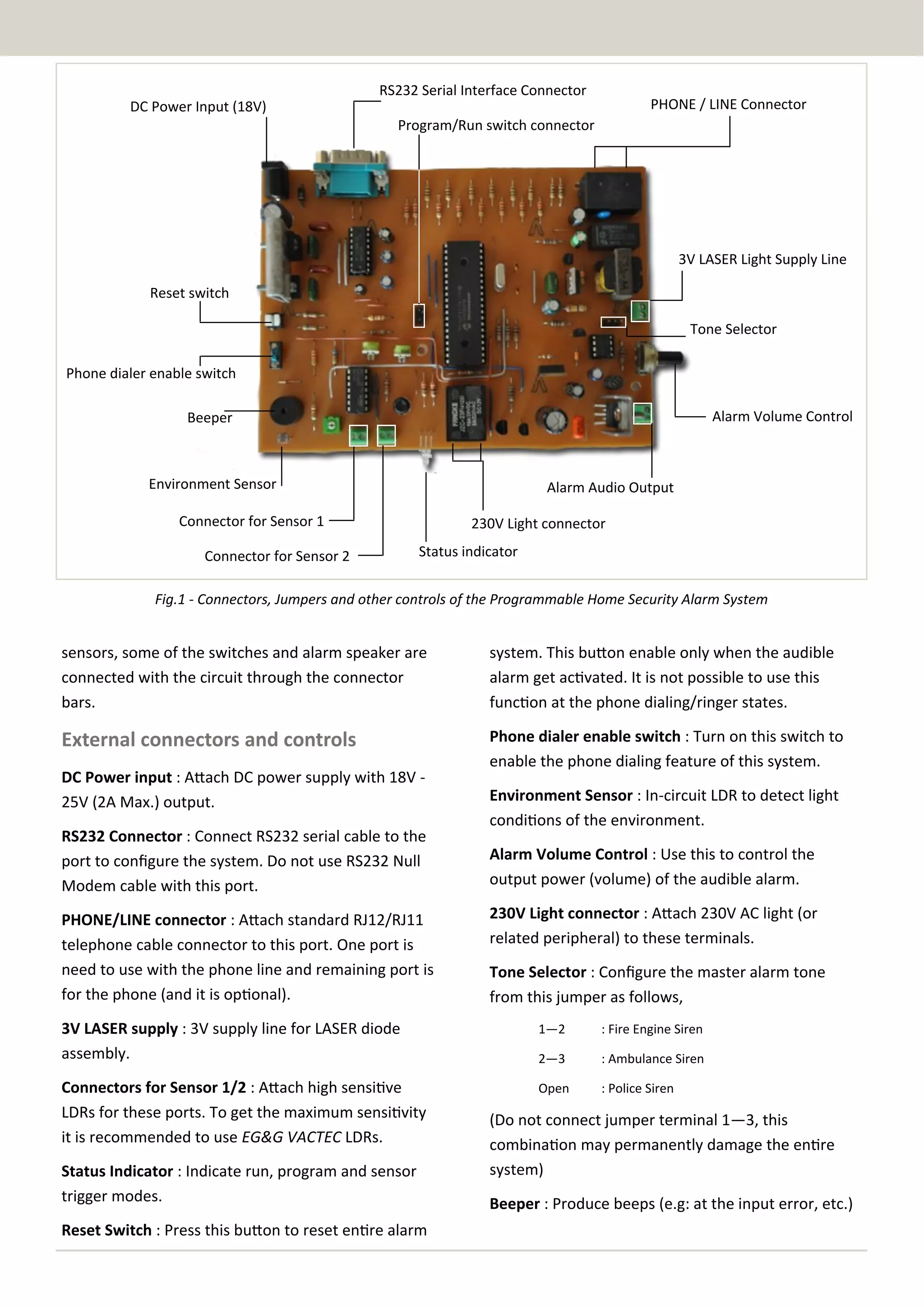 The document details the design and implementation of a low-cost, high-performance programmable home security system using light-dependent resistors (LDRs) as input sensors. The system can dial a user-specified phone number and activate audio alarms and lights when triggered, with all parameters configured through an RS232 interface. It includes multiple features such as selectable alarm tones, a microcontroller-based architecture, and various safety and testing procedures for assembly and calibration.