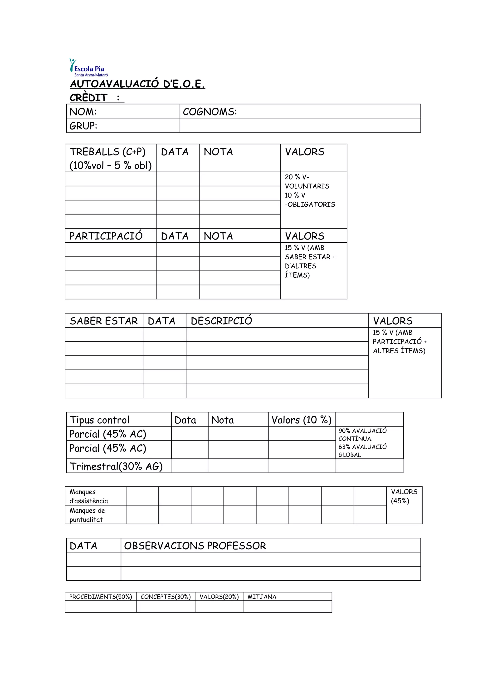 PROCEDIMENTS(50%) CONCEPTES(30%) VALORS(20%) MITJANA
