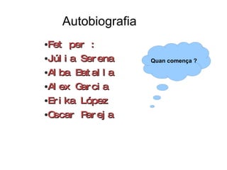 Autobiografia 1. 2. 3. 4. 5. 6. 7. 8. 9. Júlia Em diuen Júlia.Baig neixer el 6 de Febrer del 1996, El meu pare es diu Jordi i va neixer el 18 de Juny del 1986.i la meva mare es diu Salomè i va neixer el 30 de Maig de 1987Els meus pares son els dos de Barcelona peró en el any 2000 es van mudar a Olivella. P3 el vaig fer a Barcelona peró de P4 a 6é el baig fer a Els CosteretsLes millors colonies per a mi van ser les de 6é, vam fer molts esports