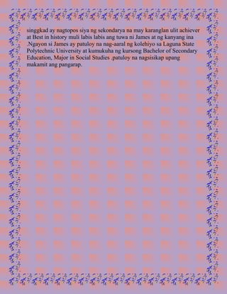 Si James Acuno Pasco ay isinilang sa Paete, Laguna noong Pebrero 11, 1992, at ulilang lubos sa ama. Sa kabila ng mga pagsubok, siya ay nagsikap sa pag-aaral mula elementarya hanggang sekondarya, kung saan nakamit niya ang mga karangalan. Ngayon, siya ay nag-aaral sa Laguna State Polytechnic University na kumukuha ng Bachelor of Secondary Education sa major na Social Studies.