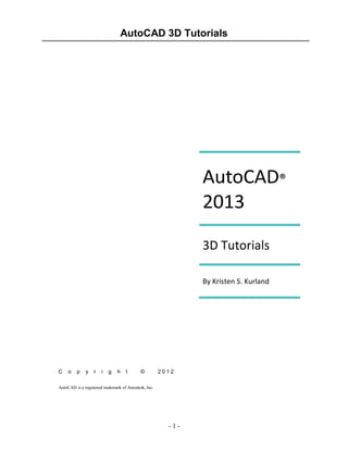 This document provides an overview of the AutoCAD 3D interface and basic 3D modeling tools. It covers topics such as launching AutoCAD and setting the 3D modeling workspace, using viewports and visual styles to view 3D models, entering 3D coordinates, and manipulating objects in the Z-axis. The document is formatted as a tutorial with sections numbered 1-4 and subsections detailing steps to practice 3D modeling techniques in AutoCAD.