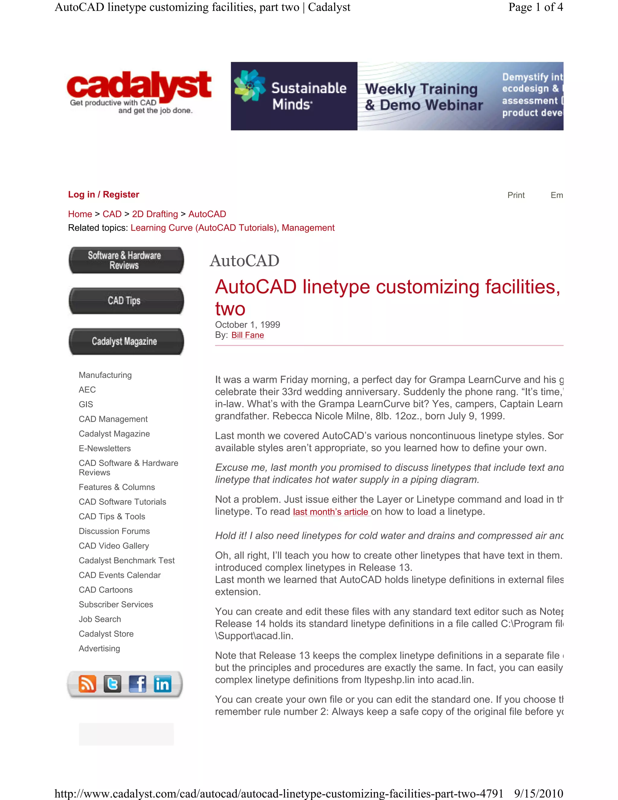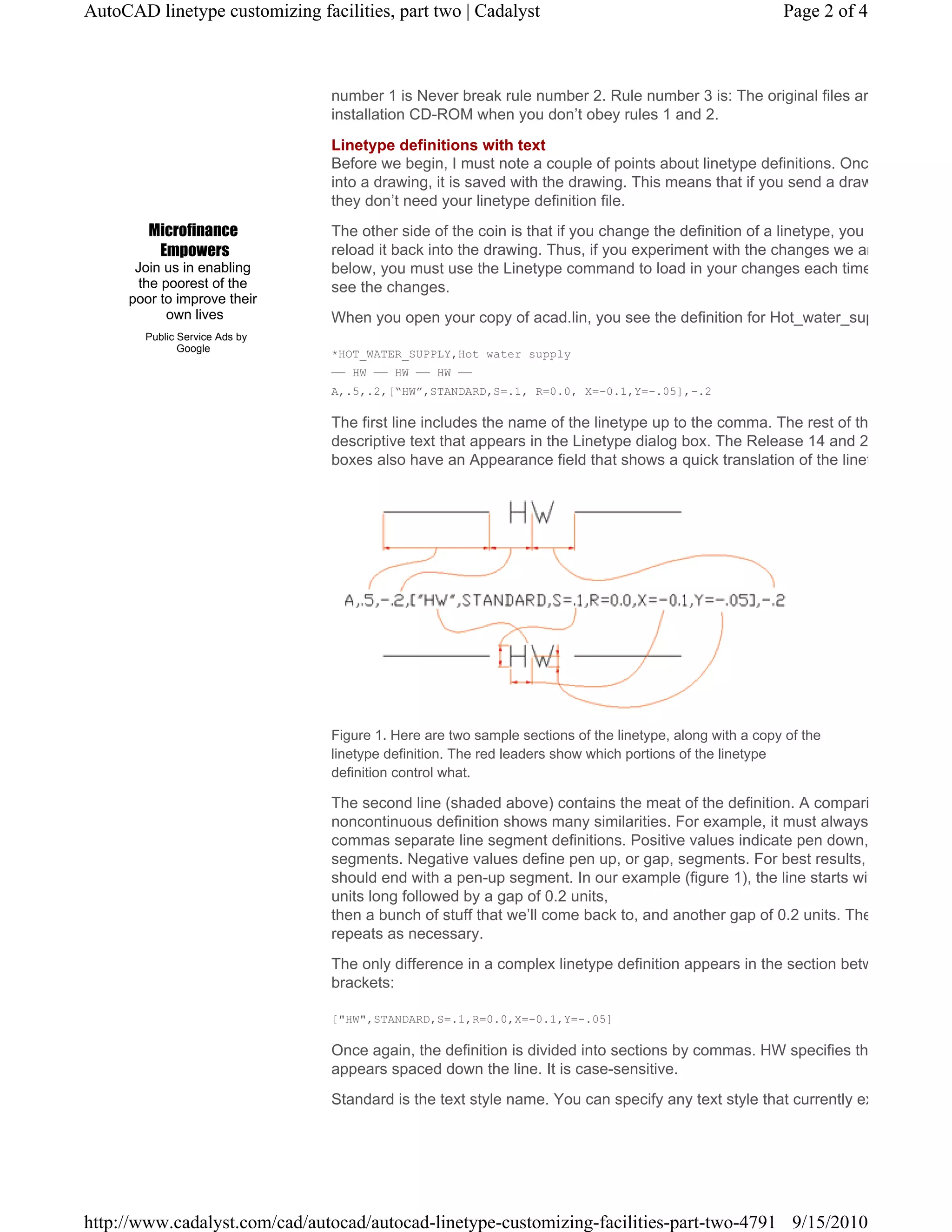 The document discusses how to create custom linetypes in AutoCAD that include text. It explains that linetype definitions are saved in external files with a .lin extension. These files can be edited to define new linetypes. The document provides an example linetype definition for a "hot water supply" linetype that includes the text "HW". It describes each component of this definition, including specifying the text, style, size, rotation, and offsets. The document notes you must adjust pen up/down distances to properly space the text. It suggests using linetypes to identify items in schematics and contours on maps. Custom linetypes can also include shapes.