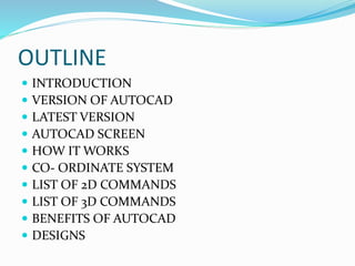 This document outlines a six-week industrial training report on AutoCAD. It discusses the history and latest version of AutoCAD, the AutoCAD interface and coordinate system, and lists common 2D and 3D commands. Benefits of AutoCAD include the ability to quickly create accurate designs and easily modify or transfer them, saving time over hand drafting. An example design of a vehicle side view is also mentioned.