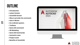 The document discusses AutoCAD 2021 and provides instructions for its use. It begins with an introduction to AutoCAD as 2D and 3D modeling software developed by Autodesk. It then covers AutoCAD's screen and interface, coordinate systems, toolbars, basic 2D commands, dimensions, 3D modeling commands like extrude and presspull, and benefits such as accurate drawing and easy editing. The document serves as a tutorial for using AutoCAD's various functions.