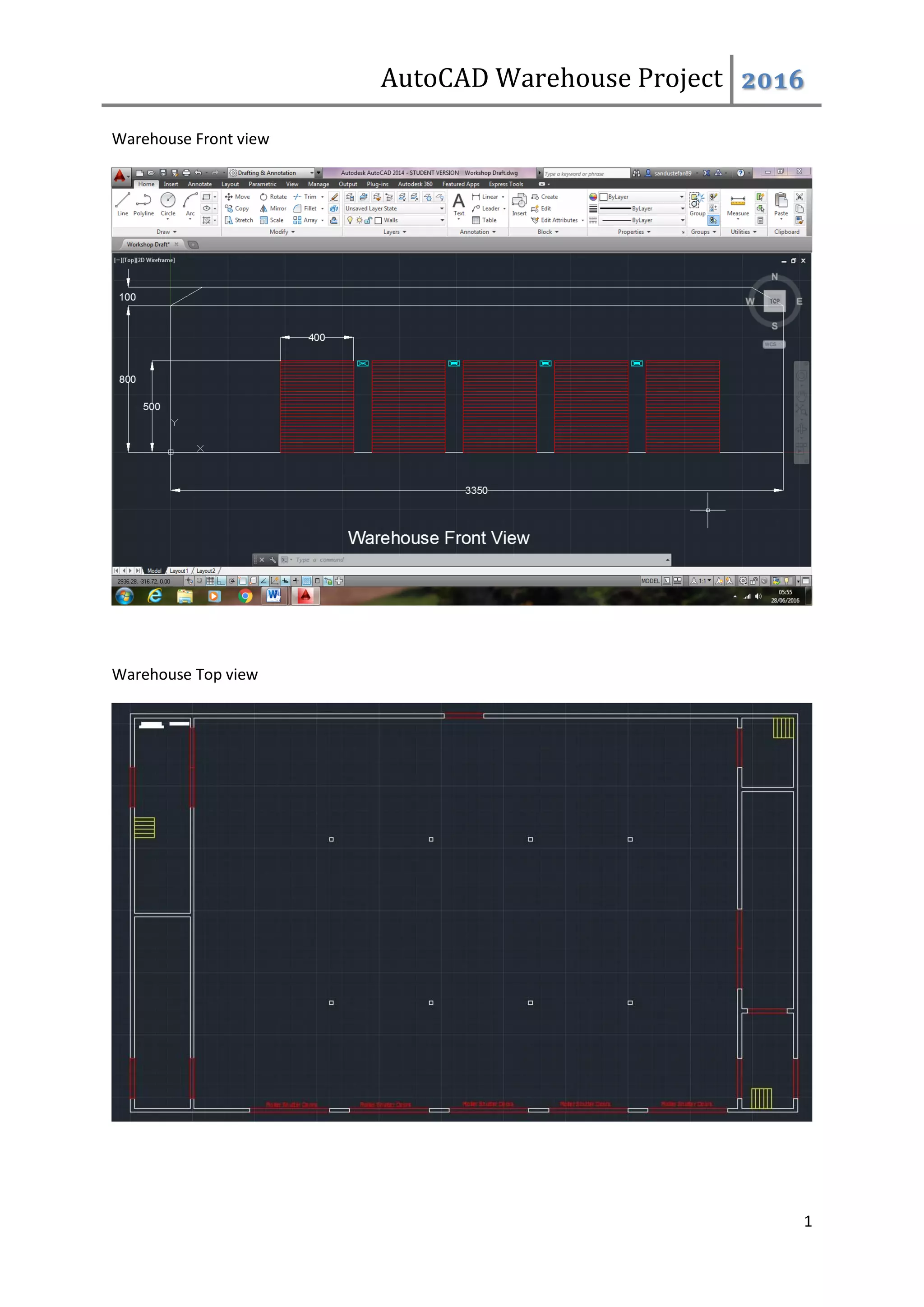 This document outlines the design sequence for an electrical distribution system for a warehouse project in AutoCAD. It includes front and top views of the warehouse, descriptions of design elements like the front entrance and metal containment, and how to create and insert blocks. It also provides details on the design process, including determining load characteristics and supply options, positioning distribution boards, and designing the distribution system by selecting cable types and sizes and calculating voltage drop, fault currents, and earth fault loop impedances. An example calculation for an outside lights circuit is shown.