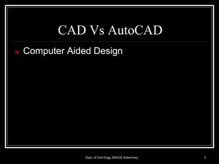 The document provides an overview of the basics of using AutoCAD software. It describes key areas of the AutoCAD interface such as the command line, drawing area, status bar and toolbars. It also outlines how to set up a drawing by defining units, limits and grid/snap settings. Basic drawing commands like lines, circles and modifying objects are explained. The document concludes with information on layers, dimensions, hatching, selecting objects and plotting a drawing.