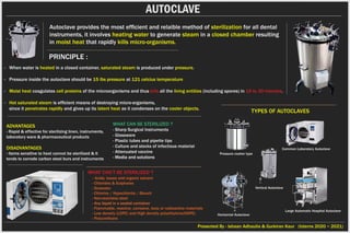 A concise poster depicting all the aspects one should know about autoclaves. It involves the definition, working principal, advantages, disadvantages, what to and what not to sterilize