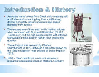 The document provides an overview of autoclaves, including their history, operational principles, and various types used for sterilization. It highlights key specifications, processes, and testing methods required to ensure effective sterilization and safety in multiple industries. Additionally, it discusses regulatory standards and qualifications necessary for autoclave performance validation.