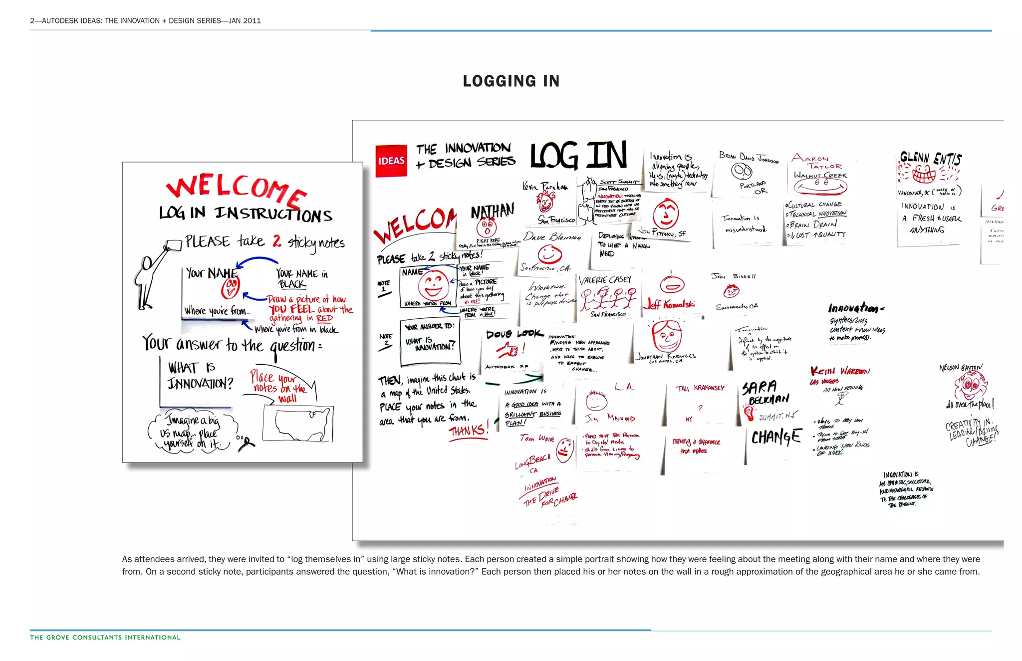 This document summarizes the two-day Autodesk IDEAS summit held in January 2011 in San Francisco. It provides a visual record of the talks, activities, and discussions that took place. The summit included conversations on design thinking, prototyping, and envisioning the future through a magazine design activity. Participants evaluated the summit and provided suggestions to improve future events. The document captures the key discussions and insights from the innovation-focused summit.