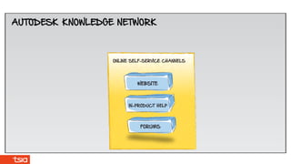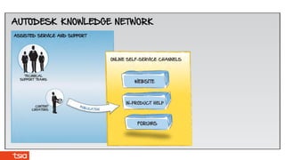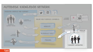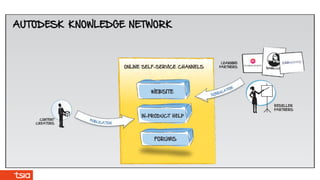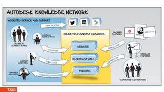 Autodesk aims to transform its business model to a subscription-based approach with a focus on enhancing self-service through a knowledge network. This strategy involves aggregating and syndicating knowledge content from various sources, encouraging community contributions, and leveraging technology for better support and documentation. Future challenges include resource allocation, partnership expansion, and ensuring quality and governance within the knowledge ecosystem.