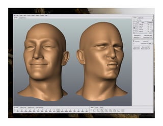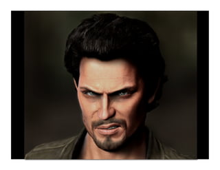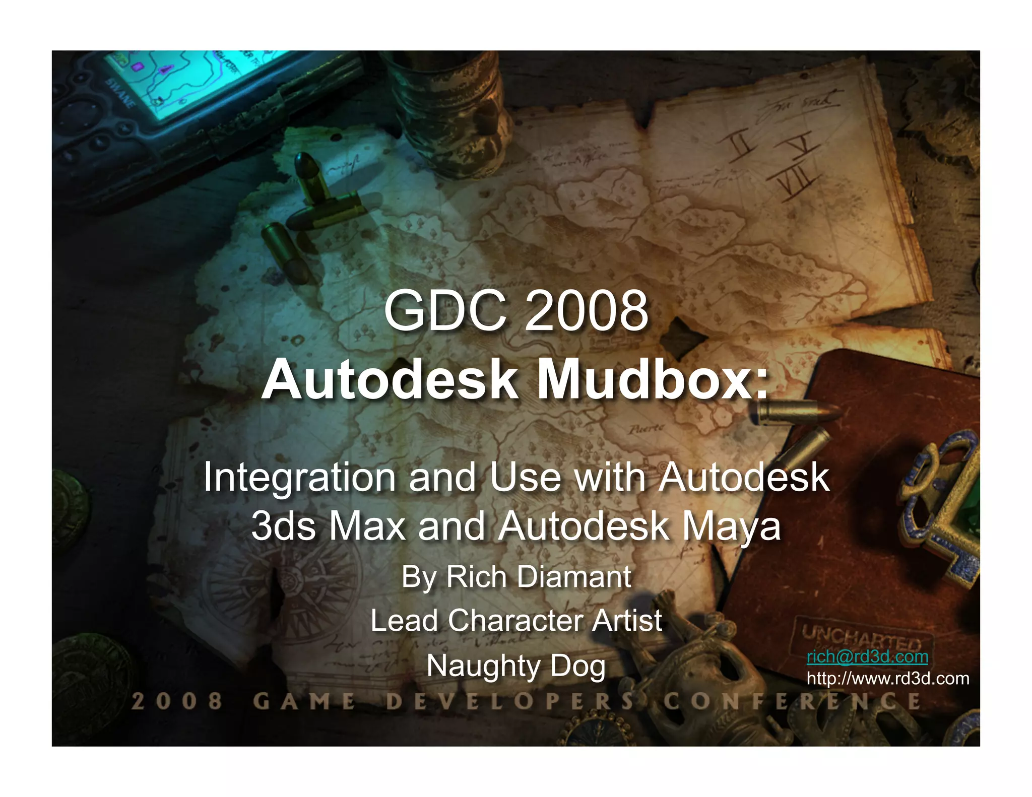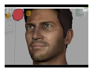 This document summarizes Rich Diamant's presentation on using Autodesk Mudbox for modeling characters in Autodesk 3ds Max and Maya. It discusses modeling methods for matching high resolution detail to arbitrary meshes. It also describes the character modeling pipeline used for Uncharted: Drake's Fortune, including the goals of realistic characters that emote well and look good close up for both cinematics and games. Key parts of the pipeline included using arbitrary meshes with blend shapes, creating wrinkle maps in Mudbox, and ensuring models met budget and quality goals for the PlayStation 3.