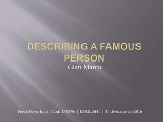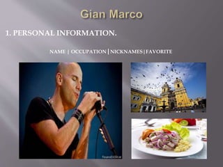 This document contains personal information about an individual including their name, occupation, family details such as spouse and children, and hobbies such as singing, playing guitar, and writing. It also lists some daily routines like living, working, and coaching.
