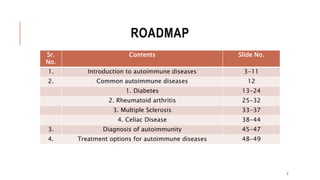 This document provides an overview of autoimmune diseases. It begins by defining autoimmunity as the immune system mistakenly attacking the body's own cells and tissues. Some common autoimmune diseases are then discussed in more detail, including type 1 diabetes, rheumatoid arthritis, and multiple sclerosis. The causes of autoimmunity are largely unknown but may involve genetic and environmental factors. Symptoms vary depending on the specific disease. Diagnosis and treatment options are also summarized for some of the major autoimmune diseases.