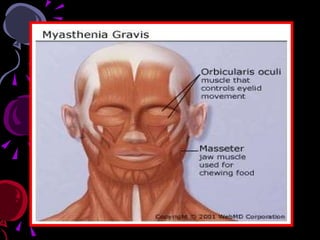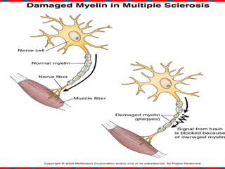 Multiple Sclerosis (MS) and Myasthenia Gravis (MG) are autoimmune disorders where the immune system attacks the body's own healthy cells. MS affects the central nervous system by damaging the protective myelin sheath surrounding nerve fibers, while MG affects the neuromuscular junction by blocking or destroying acetylcholine receptors. Common symptoms of MS include sensory issues, muscle weakness, fatigue and vision problems. MG symptoms often begin with eye weakness and drooping eyelids and may progress to generalized weakness. While there is no cure for either condition, treatments can help manage symptoms and delay disease progression.
