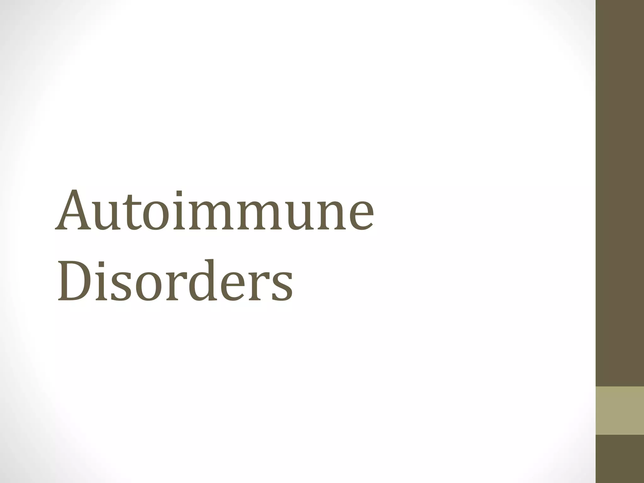 This document provides information on autoimmune disorders like rheumatoid arthritis and systemic lupus erythematosus. It explains that autoimmunity occurs when the immune system attacks the body's own cells, causing diseases. Rheumatoid arthritis specifically causes joint inflammation and damage through autoantibodies attacking joint linings. Systemic lupus erythematosus more broadly attacks tissues, producing symptoms like rashes, fever, and kidney issues. Both have no cure but can be treated to reduce immune response and manage symptoms.