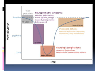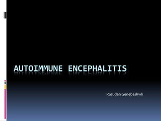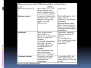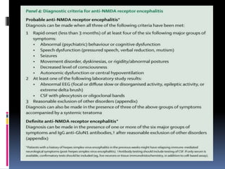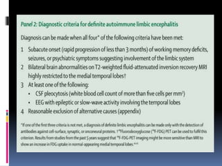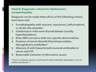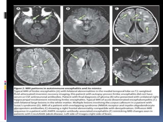 This document discusses several types of autoimmune encephalitis, including Hashimoto's encephalopathy, NMDA encephalitis, and limbic encephalitis. Hashimoto's encephalopathy is defined by the presence of thyroid peroxidase antibodies in patients with encephalitis that responds to steroids. It can cause non-specific neurological symptoms. NMDA encephalitis commonly affects young women and can cause psychiatric issues, decreased consciousness, and movement disorders. Diagnosis involves detecting NMDA receptor antibodies in CSF or serum. Limbic encephalitis involves inflammation of limbic structures and is associated with antibodies against proteins like LGI1; it typically causes memory loss, behavioral changes and seizures in older patients.