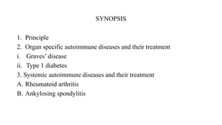 This document discusses autoimmune diseases, including their causes, symptoms, diagnosis, and treatment. It covers two types of autoimmune diseases: organ-specific and systemic. For organ-specific, it describes Graves' disease and type 1 diabetes. For systemic, it describes rheumatoid arthritis and ankylosing spondylitis. The causes involve genetic factors like certain HLA alleles that can make one susceptible. Symptoms, diagnosis, and treatments are provided for each disease.