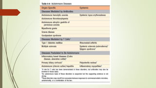 The document provides an overview of autoimmunity, detailing various mechanisms such as central and peripheral tolerance, and the development of autoimmune diseases such as rheumatoid arthritis, Sjögren’s syndrome, and systemic sclerosis. It discusses the role of genetic susceptibility, environmental triggers, and the pathological processes involved, outlining clinical features and diagnosis for each condition. Additionally, it highlights the importance of immune regulatory mechanisms and the consequences of their failure in autoimmune pathogenesis.