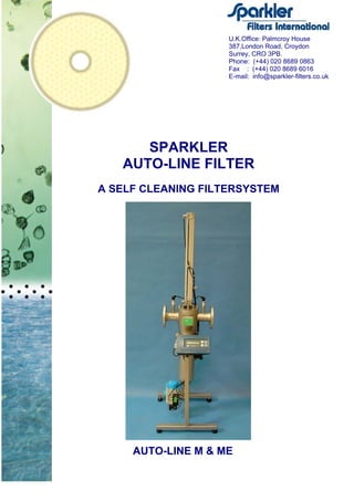 The Sparkler Auto-Line filter is an automatic self-cleaning filtration system designed to operate continuously, utilizing an asymmetric edge gap element to trap particles inside the filter. It is available in two versions, with the 'me' variant offering enhanced protection for contaminants, and both models comply with pressure vessel regulations. The filters are constructed from stainless steel and come equipped with a PLC or pneumatic controller for automated operation.