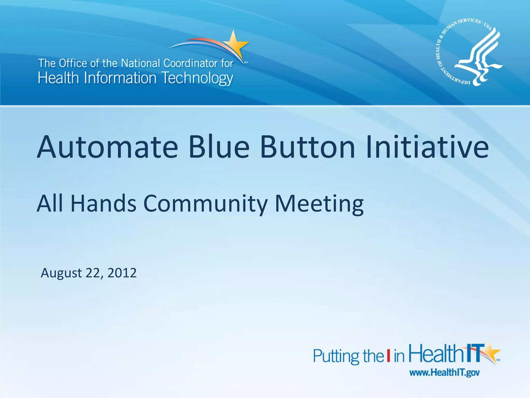 This document provides an overview of an upcoming community meeting to discuss the Automate Blue Button Initiative project charter. The meeting will include a call to action for participants to join the initiative, a review and discussion of each section of the project charter, and an explanation of relevant standards and stakeholders. The project charter establishes the challenge of automating the transmission and access of personal health data via the Blue Button, sets goals and a scope statement, and outlines a value statement, success metrics, milestones, deliverables, and standards. Participants are invited to review and provide input on the charter sections.